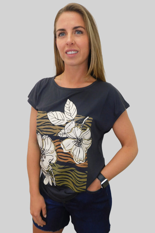 Ladies Trendy Charcoal Tee with Abstract Flowers and Animal Print
