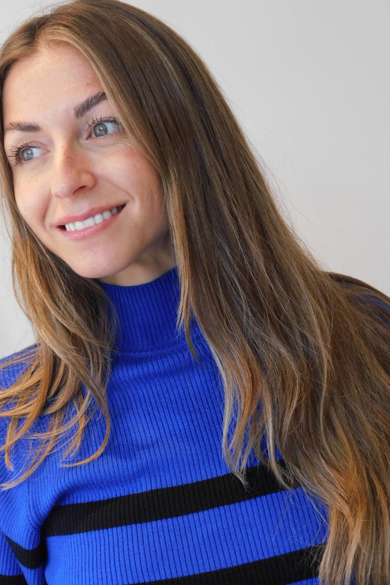 A style to add to your staple wardrobe. Designed in a timeless black and camel colour palette, our super soft jumper features a classic striped design, high neck and long balloon style sleeves. We wear ours with jeans for a casual weekend look.