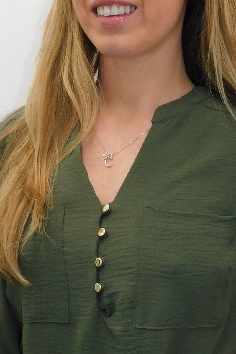 This Olive Long Sleeve Gold Button Front Shirt is a wardrobe staple! Featuring a round neck collar, a gold button up front, and long cuffed sleeves with a single gold button. Dress it up for a night look with leather pants and heels, or dress it down for day time with jeans and some flats.