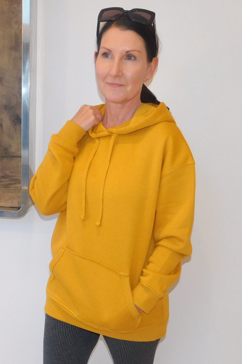 Stay cosy with our bold mustard coloured oversized hoodie. A great addition to any work out wardrobe and perfect to throw on over t-shirts for an everyday look. Featuring a hood, drawstring and front pouch pocket.