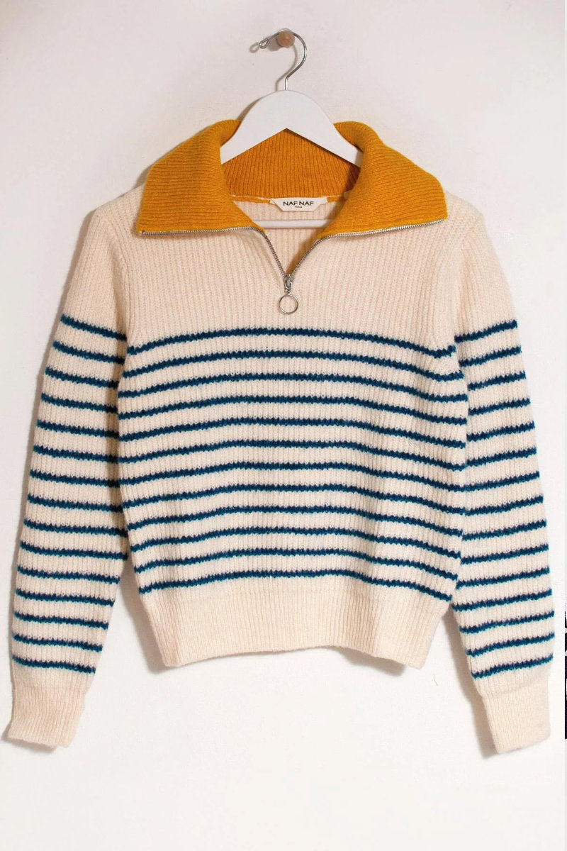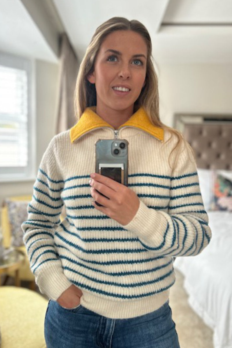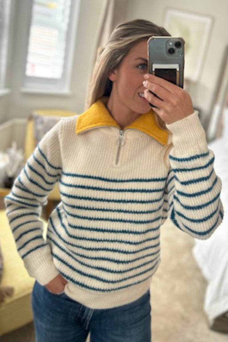 Stay cosy and stylish with this ‘go to’ quarter zip jumper, designed for warmth and comfort. The classic ivory knit with navy stripes is elevated by a striking contrast yellow collar, adding a pop of colour to this wardrobe essential. Perfect for layering over jeans and pairing with boots, it’s ideal for chilly days when you need a reliable, relaxed-fit top.