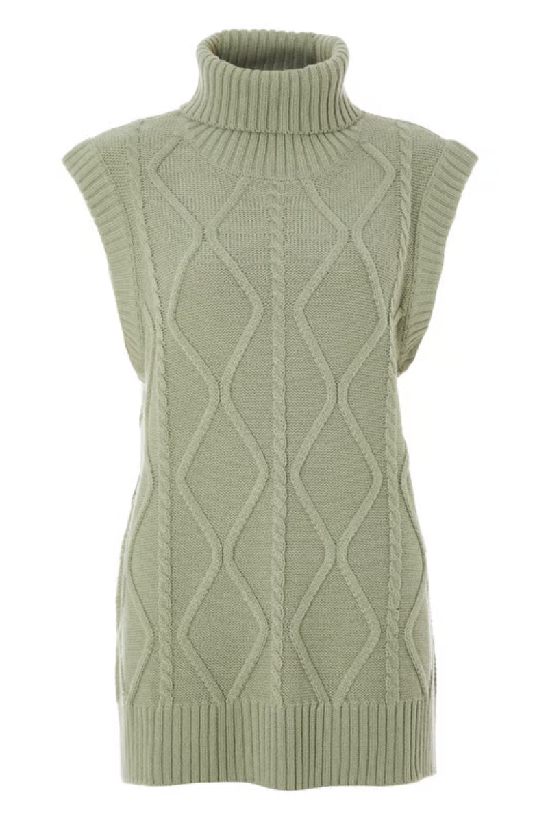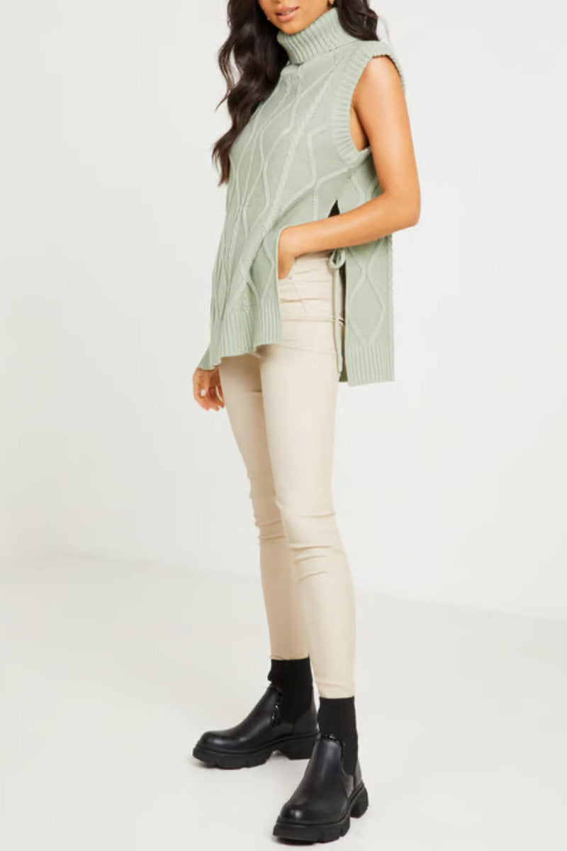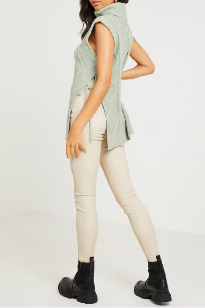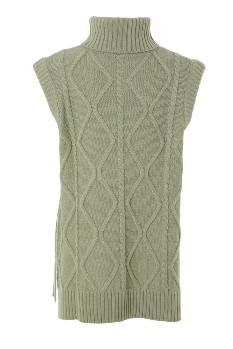 This Sage Cable Knit Sleeveless Jumper brings a sophisticated edge to your seasonal wardrobe. Designed with a classic cable knit pattern, this jumper is sleeveless and features a stylish roll neck that adds warmth and charm. The unique side ties add a contemporary twist, making it a versatile layering piece perfect for chilly days. Pair it over a fitted top or shirt for an effortlessly chic look.