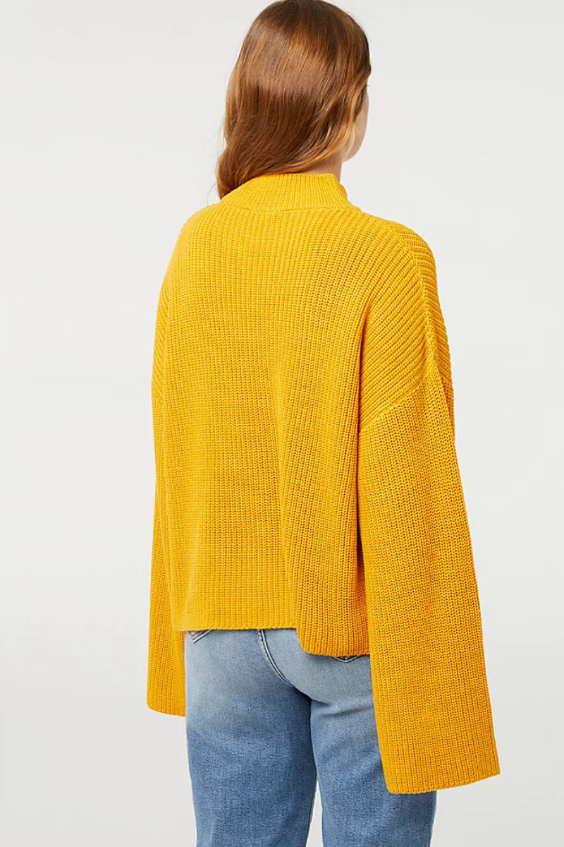 For those who prefer a dash of sunshine in their attire, this Solar Flare Knit Jumper in vibrant yellow is a beacon of joy. Made from eco-friendly recycled acrylic, it brightens up the gloomiest days without compromising on style or warmth. The bell-shaped flared sleeves inject a playful spirit into your ensemble, while the cosy turtle neck ensures you remain toasty when the temperature drops. Its relaxed fit offers comfort and flexibility, making it an effortless match with casual and smart outfits alike, truly a piece that captures the essence of sunny days.