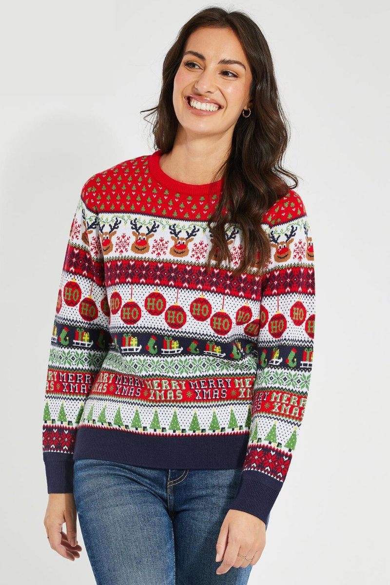 - Classic Fair Isle pattern with reindeer and festive motifs